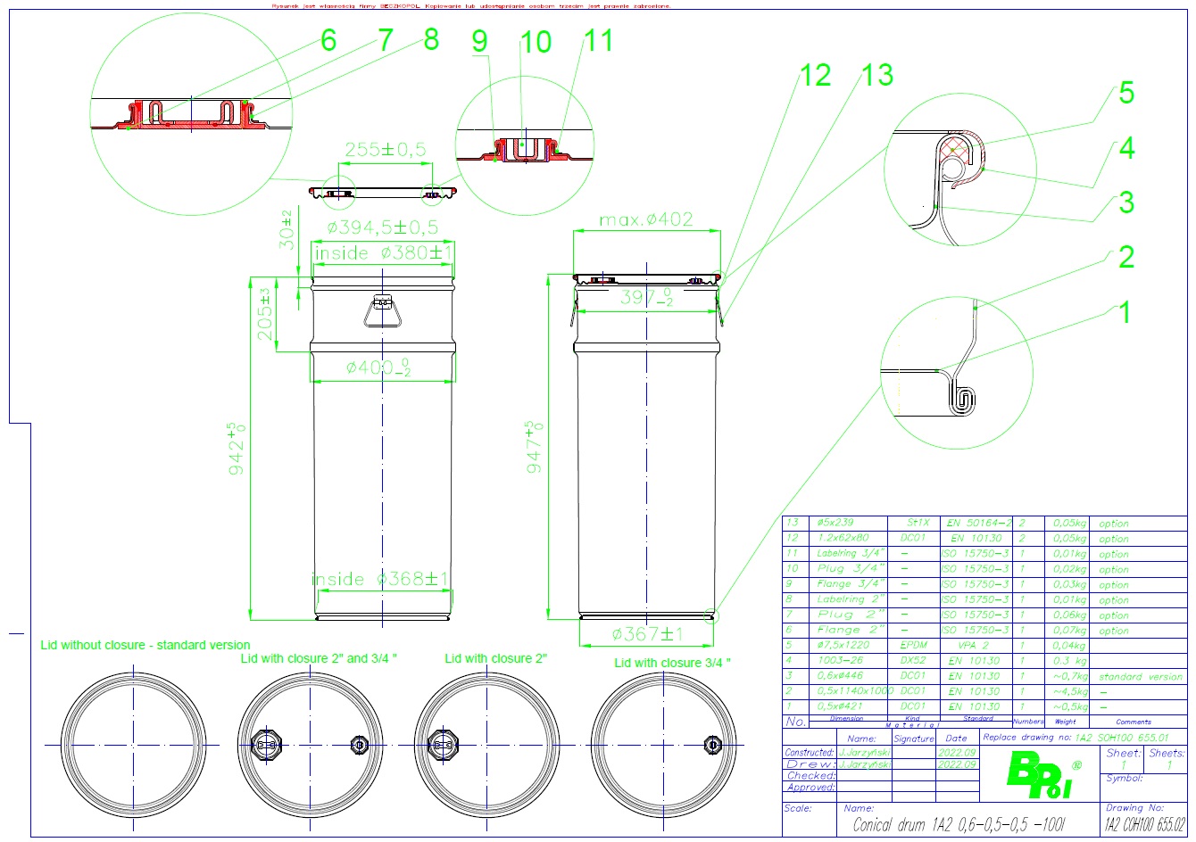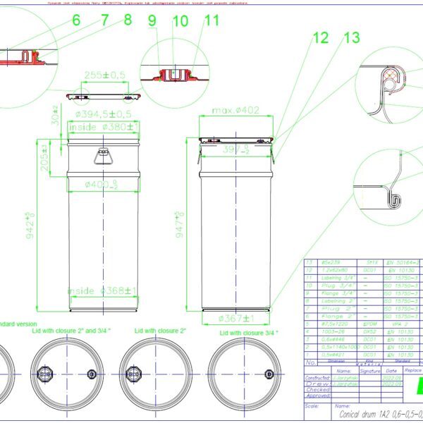- – grubość blachy (wieko-pobocznica-dno): 0,6 – 0,5 – 0,5 mm