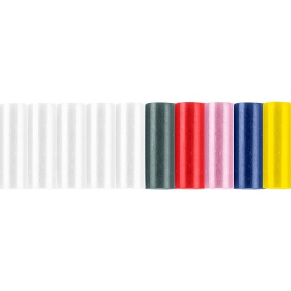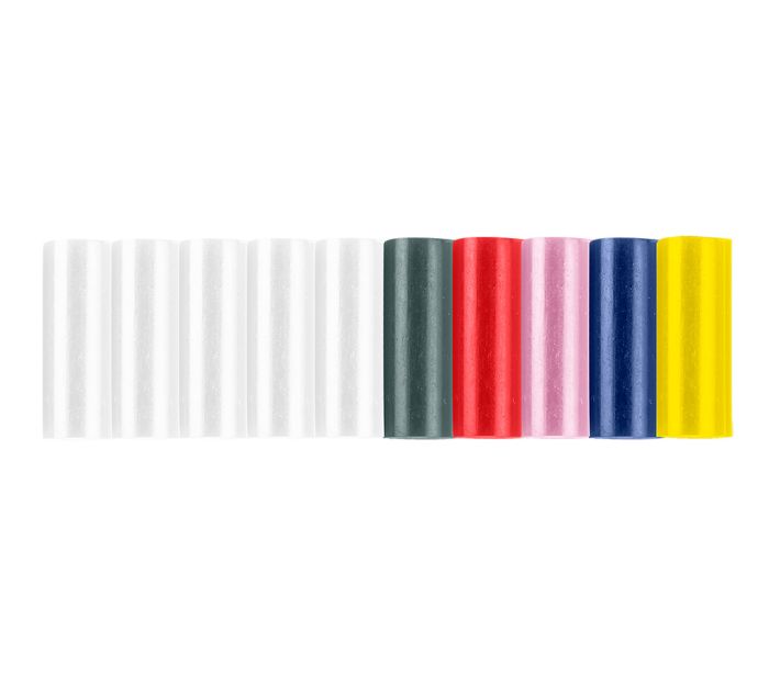 10 dodatkowych lasek kleju w różnych kolorach o średnicy 8 mm i 20 mm długości.