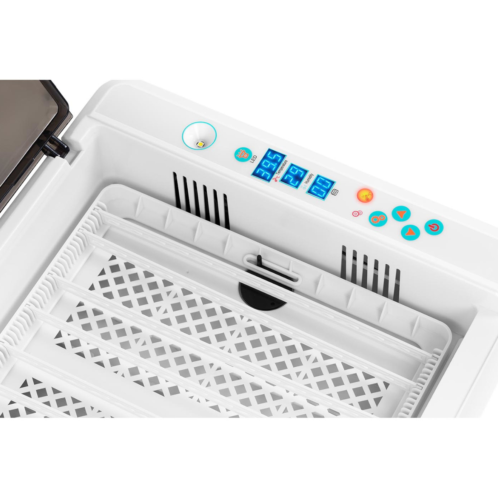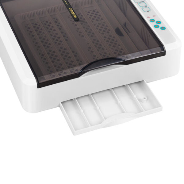 Uniwersalna tacka pomieści 36 jaj kurzych a także jaja przepiórcze, gęsie, gołębie oraz kacze. Przezroczysta pokrywa pozwala śledzić przebieg wylęgu. Urządzenie posiada czytelny panel z ekranem LED, automatyczną kontrolę grzania oraz rotację jaj.