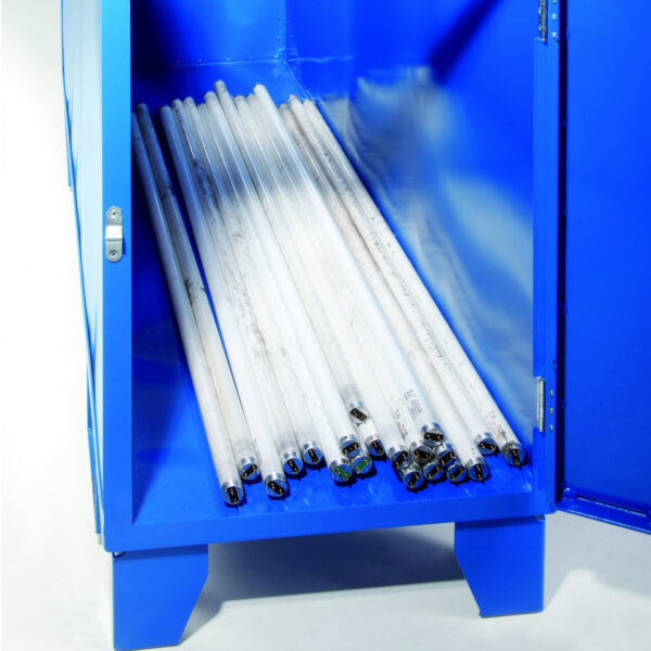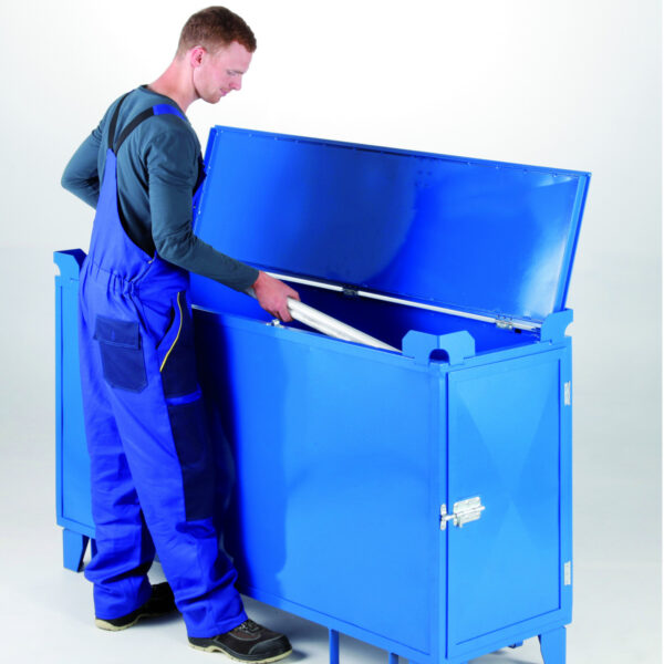 Wysokiej jakości, wytrzymały kontener z otwieranym wiekiem oraz bokiem doskonale sprawdzi się w miejscach gdzie zachodzi potrzeba zbierania i przechowywania zużytych świetlówek i żarówek. Konstrukcja pojemnika umożliwia przemieszczanie go za pomocą wózka widłowego lub podnośnika dźwigowego. Pojemnik posiada otwierane drzwiczki boczne oraz górne wieko. Kontenery można składować jeden na drugim do 4 warstw.
