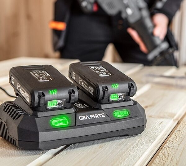 Ładowarka do akumulatorów GRAPHITE Energy+ 18V Li-Ion, maksymalny prąd ładowania 2 x 3A, czas ładowania akumulatora 58G001 wynosi 45min, czas ładowania akumulatora 58G004 wynosi 90 min, a czas ładowania akumulatora 58G086 wynosi 135 min.