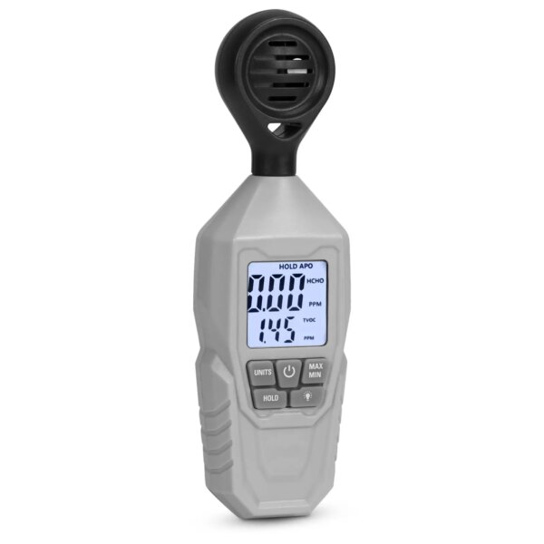 - – Zakres detekcji – HCHO: 0 – 5 mg/m³ (lub PPM) / TVOC: 0 – 9,99 mg/m³ (lub PPM)