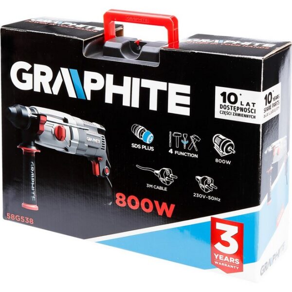 Młotowiertarka SDS+ 800 W, 2,8J, walizka 58G538 marki GRAPHITE to specjalistyczne narzędzie SDS+ o mocy 800 W, posiadające funkcje wiercenia, wiercenia z udarem pneumatycznym, podkuwania i możliwość regulacji bezstopniowej kąta ustawienia dłuta do precyzyjnego podkuwania. Umożliwia wykonanie otworów do 26 mm średnicy w betonie i cegle, 13 mm w stali oraz 30 mm w drewnie. Narzędzie posiada funkcje zmiany kierunku obrotu wrzeciona, stopniowej regulacji prędkości i blokadę włącznika do pracy ciągłej. Podczas wiercenia młotowiertarka osiąga do 1350 obrotów na minutę, a po przełączeniu na udar do 5500 uderzeń na minutę. Energia udaru w narzędziu wynosi 2,8 J. Komfortowa rękojeść główna narzędzia pokryta jest antypoślizgową nakładką, dobrze więc leży w dłoni. W zestawie znajdują się: dodatkowe wiertło, uchwyt wiertarski, adapter do uchwytu oraz walizka transportowa. Urządzenie wyposażone jest w elastyczny i trwały przewód zasilający w powłoce gumowej o długości 3 m, dedykowany także do zastosowań profesjonal