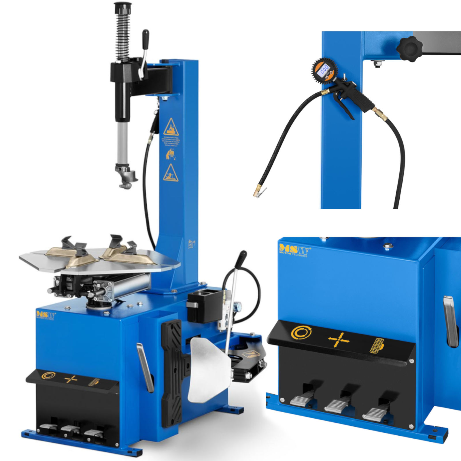Urządzenie umożliwia wymianę opon na felgach o średnicy 11- 22”. Montażownica posiada system samocentrujący 4- szczękowy, który stabilizuje felgę w żądanej pozycji. Zbijak o sile 2500 kg odrywa oponę od obręczy. Ukształtowanie głowicy oraz nakładki zabezpieczają felgę przed uszkodzeniem podczas demontażu. Pneumatyczny pistolet szybko pompuje koło. Obsługa za pomocą pedałów pozostawia wolne ręce. Powierzchnia robocza wynosi 540 x 540 mm co pozwala na komfortową pracę z felgami w rozmiarze do 22 cali. Ergonomiczny stół obraca się z siłą 1100 Nm, usprawniając montaż i demontaż opony. Urządzenie posiada gumową osłonę która chroni felgę oraz maszynę przed uszkodzeniem.