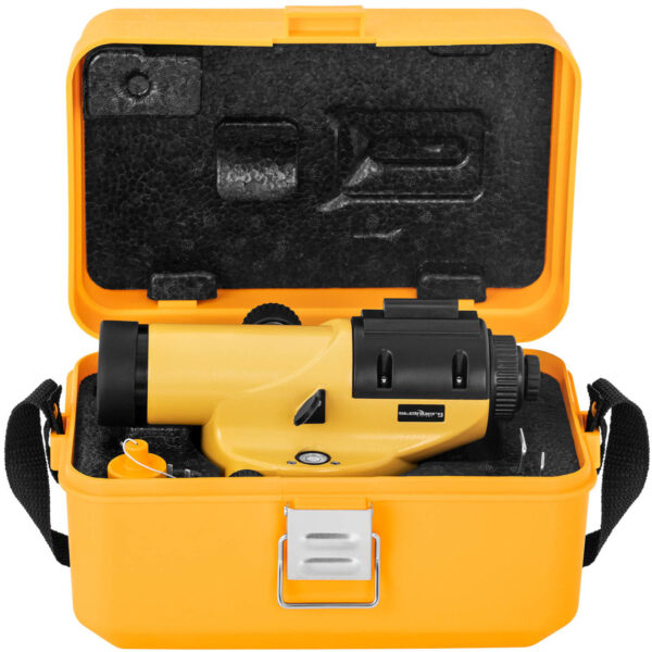 Dobra widoczność zagwarantowana jest dzięki obiektywowi o średnicy 36 mm. Obraz można przybliżyć 28-krotnie przy pomocy pokrętła. Minimalna ogniskowa to 0,3 m a odchylenie standardowe wynosi mniej niż 1,5 mm. Magnetyczny kompensator odpowiada za równowagę urządzenia i tłumi drgania wytworzone przez koparki czy betoniarki. Pudełkowa libella z lustrem ułatwia i przyspiesza ustawienie właściwego poziomu niwelatora. Dołączone akcesoria znacznie ułatwiają pracę. Statyw posiada regulowaną wysokość, łata niwelacyjna ma 5-segmentową konstrukcję, po rozłożeniu jej długość to 5m. Front listwy posiada skalę wyrażoną w cm z podziałem geodezyjnym (E) natomiast tył posiada wartości wyrażone w mm.