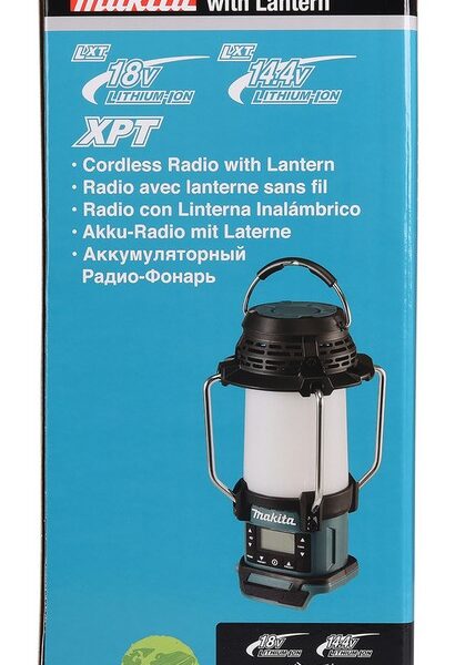 Akumulatorowe radio z wbudowaną lampą, zasilane akumulatorem 18 V Li-Ion.Urządzenie wyposażone jest w funkcję pamięci trybu – zapamiętuje ustawienia trybu świecenia w momencie wyłączenia. Posiada 2 tryby świecenia: latarnia (360°) oraz tryb latarni (3 strony), a także cyfrowy wyświetlacz LCD oraz cyfrowy wybór stacji radiowych. Osłona latarni, służy również za antenę.