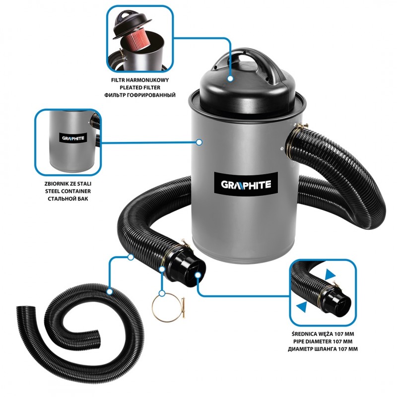 Odciąg wiórów i trocin 1100 W, 50 L, 59G611 marki GRAPHITE to urządzenie o mocy silnika 1100 W oraz mocy ssania 2,5 kPa.