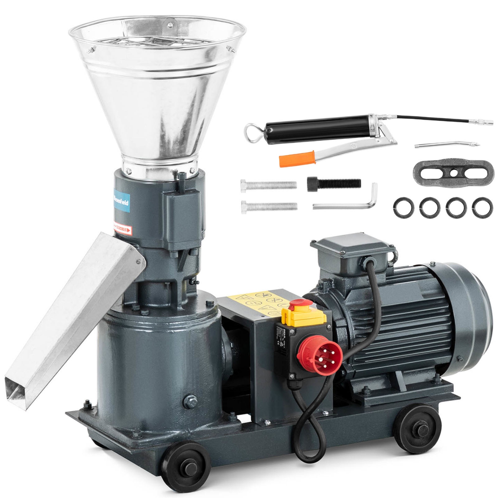 Profesjonalna peleciarka przemysłowa marki Wiesenfield służy do produkcji pelletu, paszy dla zwierząt i granulatu z różnych materiałów organicznych. Granulator daje możliwość wykorzystania drewnianych trocin, słomy, łupin orzechów, łusek ryżowych czy papieru. Są one umieszczane w specjalnej matrycy z otworami o średnicy 6 mm, gdzie poddaje się je działaniu wysokiego ciśnienia i temperatury (60-80deg;C). Część materiałów wymaga użycia specjalnych spoiw. Peleciarka jest w stanie wytworzyć 60-100 kg paszy oraz 40-60 kg pelletu z trocin w ciągu godziny. Nad ochroną użytkownika czuwa specjalny hamulec bezpieczeństwa. 4 kółka zapewniają mobilność maszyny oraz ułatwiają transportowanie.