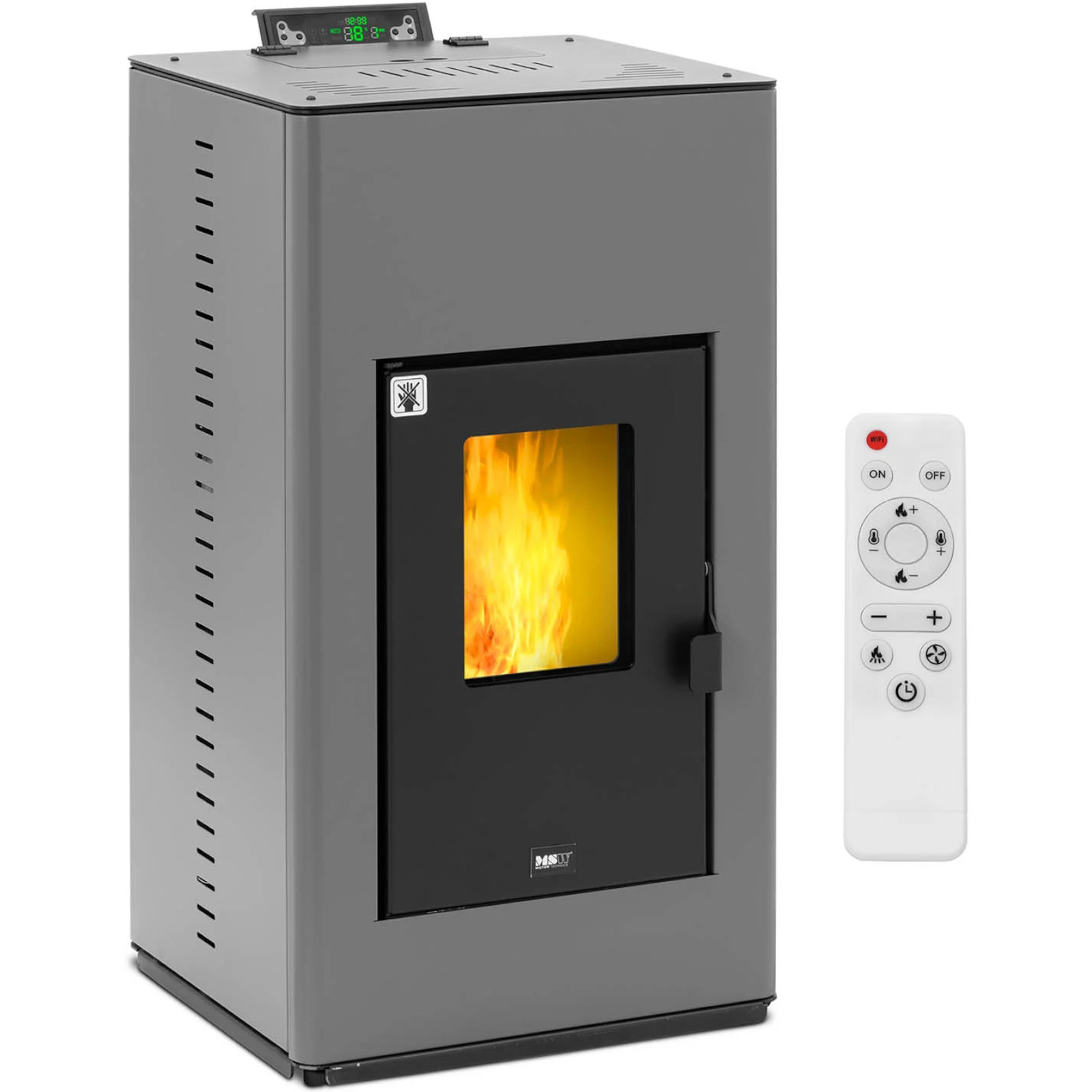- – Ogrzewa pomieszczenia o powierzchni 380 m³ lub wodę do 25 l mocą 20 kW i zużyciem 1 – 3 kg pelletu na godzinę,
