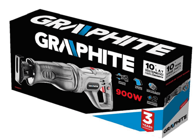 Specjalistyczna pilarka szablowa GRAPHITE z silnikiem o mocy 900W, przeznaczona do precyzyjnego cięcia drewna, metalu i innych tworzyw o zróżnicowanej twardości.