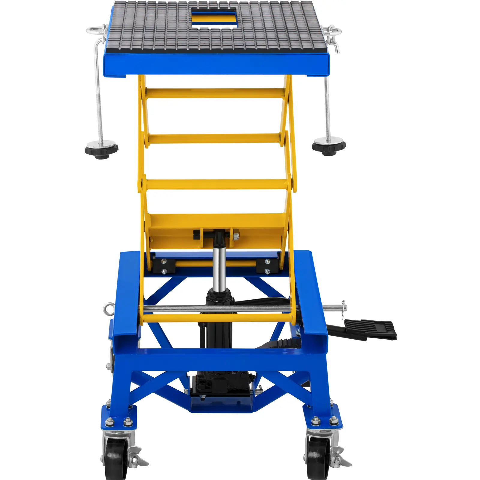 Podnośnik motocyklowy o udźwigu do 150 kg sprawdzi się do podnoszenia i podtrzymywania motocykli, takich jak motocrossy, skutery czy maszyny enduro w warsztatach motocyklowych, samochodowych i naprawczych. Platforma podnośnika nożycowego ma powierzchnię 41 x 35 cm i oferuje wystarczająco dużo miejsca, aby położyć narzędzia w zasięgu ręki. Cztery nóżki solidnej stalowej konstrukcji mają cztery kółka z hamulcami, zapewniając bezpieczną pozycję. Motocykl przymocowuje się do platformy za pomocą pasków napinających i oczek w kształcie litery U. Następnie łatwo podnieść pojazd na żądaną wysokość roboczą. Dzięki kółkom podnośnik do motocykla wygodnie wykorzystać i łatwo przestawić w dowolne miejsce. Pedał nożny pozwala łatwo obsłużyć urządzenie. Platforma jest podnoszona na wysokość od 35 do 87 cm. Oznacza to, że nawet przestrzeń pod motocyklem jest łatwo dostępna podczas prac konserwacyjnych lub napraw. Aby równomiernie obniżyć podnośnik motocyklowy, wystarczy wypuścić powietrze za pomocą pedału nożnego. Sprzęt sprawdzi się nie tylko podczas napraw jednośladów, ale także do podnoszenia i podpierania zbiorników paliwa, wahaczy, osi itp