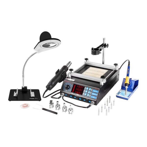 - – zintegrowana stacja lutownicza 4w1 (moduł sterujący, lutownica grotowa, moduł HOT AIR, podgrzewacz PREHEATER, chwytak kolby Hot Air)