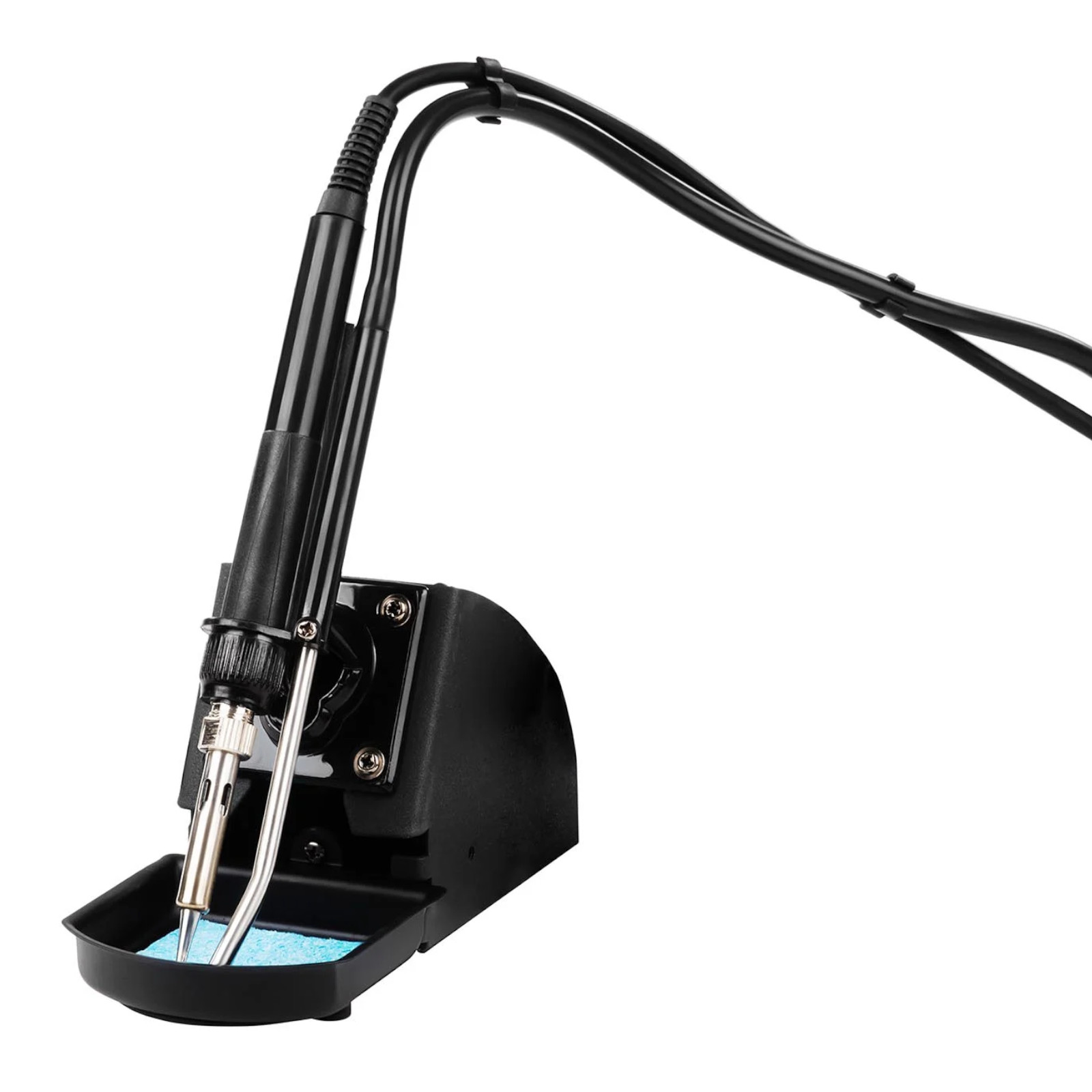 Stacja lutownicza została zaprojektowana z myślą o wykonywaniu różnych prac z dzieciny elektroniki, także obróbki tworzyw sztucznych. Wysoka moc stacji wynosi 720 W. Moc kolby lutowniczej wynosi 75W, a kolby na gorące powietrze 550W. Praktyczne pokrętło pozwala na regulację ilości powietrza. Funkcja Cool schładza kolbę i wydłuża czas eksploatacji. Regulacja temperatury w zakresie 100 do 480deg;C następuje za pomocą pokręteł z przodu urządzenia. Duży wyświetlacz LCD z podświetlaniem umożliwia łatwy odczyt parametrów. Urządzenie posiada opcję pamięci i trzy przyciski do zapisu danych. Odsysanie dymów lutowniczych odbywa się za pomocą specjalnej rurki. Funkcję włącza się przyciskiem, a siłę zasysania reguluje pokrętłem. Funkcja Sleep powoduje zmniejszenie temperatury kolby po odłożeniu na podstawkę z gąbką a następnie wyłączenie w ustawionym czasie. Ponowne jej podniesienie włącza urządzenie. Akcesoria znajdujące się w zestawie ułatwiają działanie i obniżają koszty użytkowania stacji lutowniczej. W komplecie stacja z kolbami, lampa ze szkłem powiększającym, 9 grotów lutowniczych, 5 dysz gorącego powietrza, pęsetę, podnośnik do komponentów IC popper oraz taśmę do rozlutowywania. Rączka sprawia, ze stacja jest łatwa w transporcie.