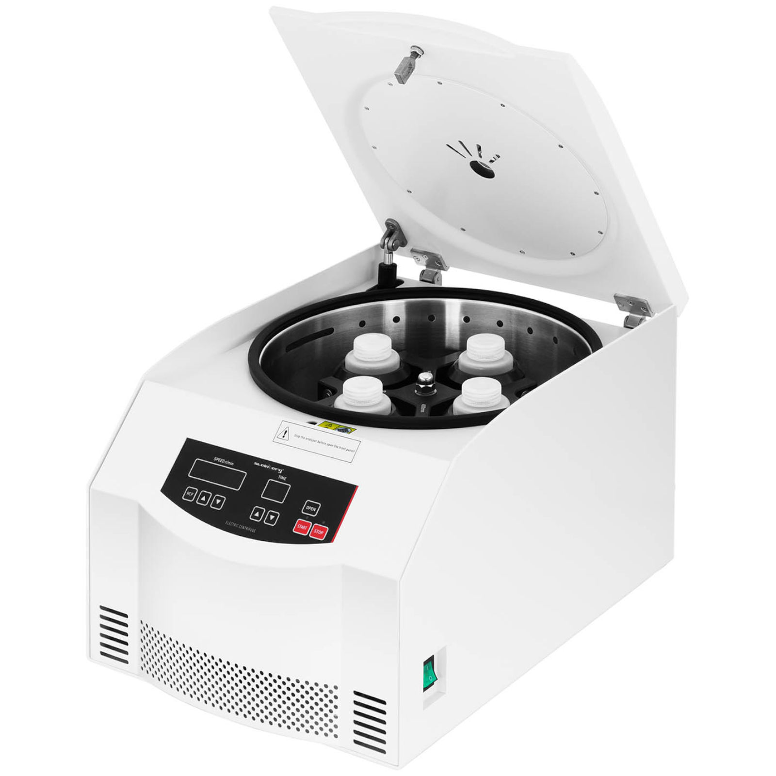 W wirówce można jednorazowo umieścić 4 probówki o pojemności 250 ml każda. Prędkość można regulować w 10 poziomach w zakresie 300-4000 obrotów na minutę, co pozwala dostosować urządzenie do rodzaju badanego płynu. Urządzenie napędza cichy bezszczotkowy silnik DC. Przed uruchomieniem sprzętu należy opuścić pokrywę, o niedomknięciu wieka poinformuje alarm. Timer pozwoli na ustalenie czasu wirowania w przedziale 0-99 min. Cyfrowy panel pozwoli na łatwe określenie wybieranych parametrów. Klawiatura pokryta jest folią, co umożliwia dezynfekcję bez ryzyka uszkodzenia urządzenia. Obudowę wykonano ze stalowej blachy Q235 odpornej, trwałej, lekkiej i niewielkich rozmiarów.