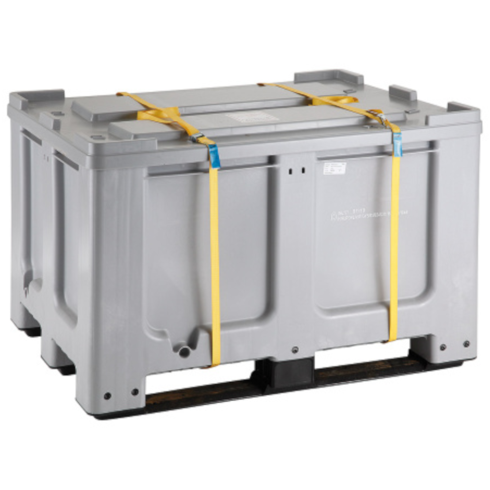 Wysokiej jakości skrzyniopaleta austriackiego producenta EUROPLAST z dopuszczeniem ADR. Kontener wraz z pokrywą i pasami mocującymi jest przystosowany do transportu towarów niebezpiecznych, takich jak zużyte urządzenia elektryczne, baterie i akumulatory, materiały sypkie itp.