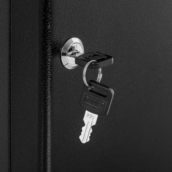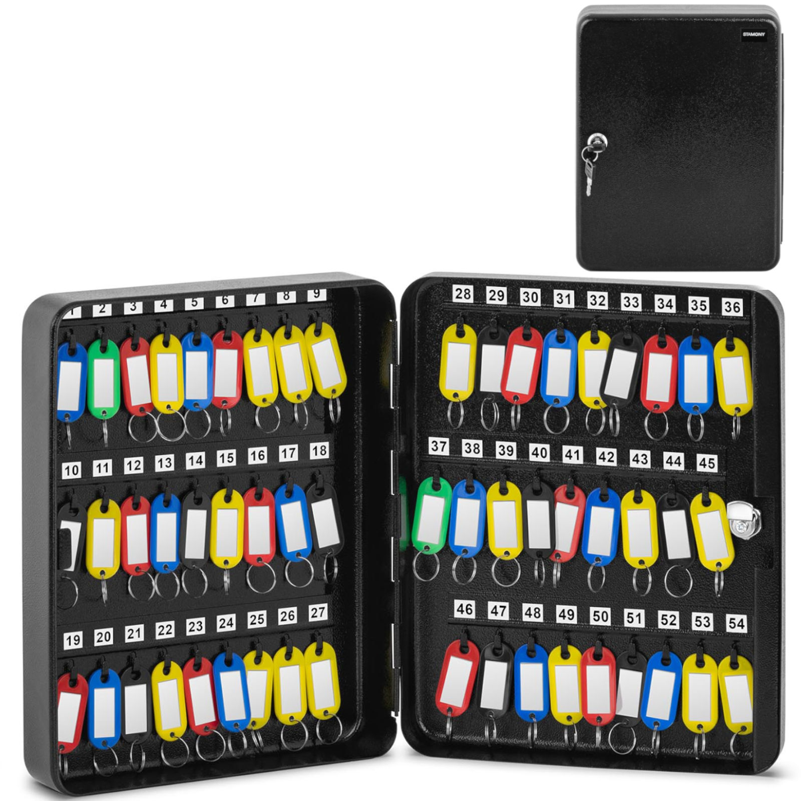 Szafka zamykana jest na klucz (2 szt. w zestawie). Skrzynkę można zamocować do ściany za pomocą nawierconych otworów. W środku szafy można przechowywać maks. 54 klucze. Szafka posiada 54 haczyki a w zestawie znajdują się 54 kolorowe zawieszki. Szafka została wykonana z blachy o grubości 0,6 mm i została pokryta matową czarna farbą.