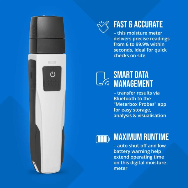 Wilgotnościomierz marki Steinberg Systems to profesjonalne narzędzie pomiarowe, które w kilka sekund dokładnie zmierzy wilgotność materiałów budowlanych, takich jak drewno, beton czy ściany. Dzięki szerokiemu zakresowi pomiaru od 6 do 99,9%, miernik pozwala na precyzyjne określenie poziomu wilgotności, co czyni go nieocenionym narzędziem zarówno w budownictwie, jak i w rzemiośle. Idealny do użytku w trakcie budowy, remontu, kontroli jakości czy oceny stanu materiałów, ten higrometr zapewnia szybkie i wiarygodne wyniki, które są niezbędne do oceny kondycji powierzchni i strukturalnej integralności obiektów. Dzięki technologii oporu, urządzenie wykonuje dokładne pomiary wilgotności drewna, betonu, wylewek i ścian, oferując pełną uniwersalność w codziennym użytkowaniu. Dzięki wbudowanemu Bluetooth pomiar wilgotności można natychmiast przesłać do aplikacji Meterbox Probes, gdzie użytkownik może przechowywać wyniki, analizować je i generować raporty. Funkcja ta umożliwia łatwe zarządzanie danymi pomiarowymi oraz śledzenie zmian wilgotności w czasie. Miernik jest niezwykle prosty w użyciu, posiada intuicyjny interfejs oraz kompaktowy design, co sprawia, że jest doskonałym wyborem zarówno dla profesjonalistów, jak i amatorów. Dodatkowo, dzięki zasilaniu bateryjnemu, urządzenie jest całkowicie mobilne, co zwiększa komfort pracy w terenie, a automatyczne wyłączanie po okresie nieaktywności zapewnia oszczędność energii i długotrwałą eksploatację. Solidna obudowa z tworzywa ABS i poliwęglanu chroni urządzenie przed uszkodzeniami mechanicznymi, zapewniając trwałość nawet w najbardziej wymagających środowiskach pracy. Jest odporny na kurz, wstrząsy i wilgoć. Dzięki swojej wszechstronności higrometr sprawdzi się przy pomiarze wilgotności materiałów konstrukcyjnych w branży budowlanej. Wbudowane ostrzeżenie o niskim poziomie naładowania baterii zapewnia kontrolę nad brakiem energii.