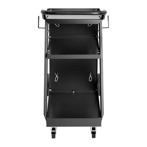 Mebel wyposażono w trzy pojemne półki, które znajdą zastosowanie w przechowywaniu akcesoriów spawalniczych. Górna półka o wymiarach 45 x 30 cm zapewnia miejsce na spawarki o różnych wymiarach. Mobilność wózka to zasługa czterech kółek. Dwa tylne są większe (śr. 150 mm), co zwiększa ich wytrzymałość na obciążenia, z kolei przednie, skrętne koła (śr. 65 mm) umożliwiają manewrowanie sprzętem.