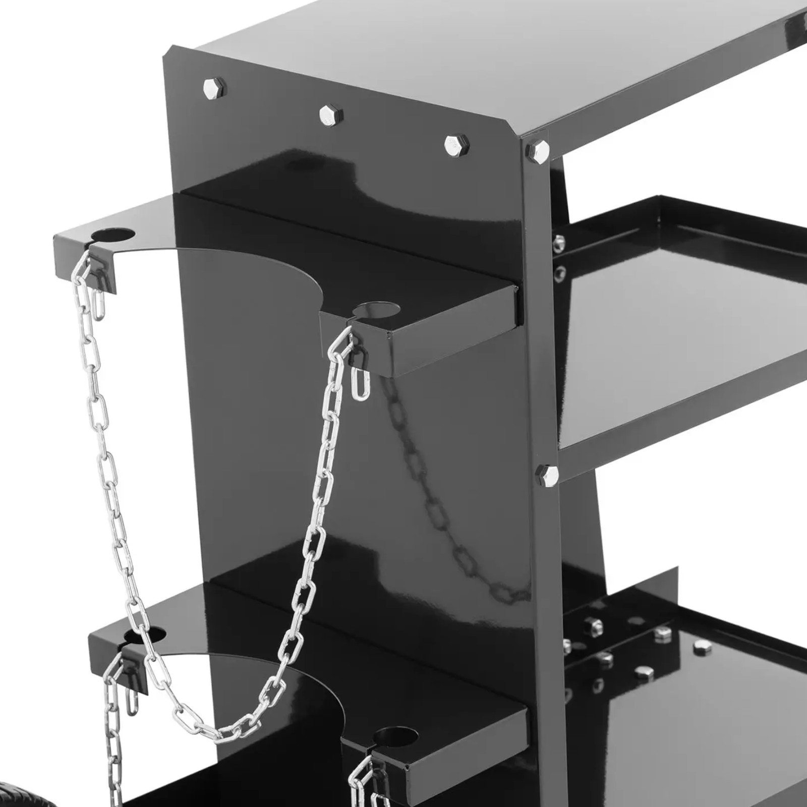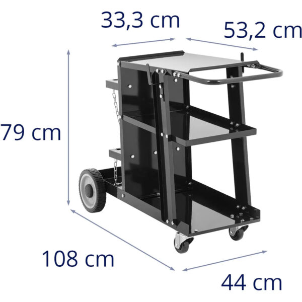 Wózek spawalniczy marki Stamos pozwala przewieźć butlę z gazem oraz wszystkie niezbędne akcesoria takie jak szczotka druciana, tuleje ceramiczne, elektrody lub dysza tnąca. Wózek sprawdzi się w małych warsztatach i na placach budowy. Wyposażono go w trzy poziomy zapewniające mnóstwo miejsca na przechowywanie rzeczy potrzebnych do spawania. Górna półka jest lekko nachylona i oferuje przestrzeń o wymiarach 33,3 x 53,2 cm na większe obiekty. Drobne akcesoria można ułożyć na środkowej półce o wymiarach 33,5 x 51,5 cm. Uchwyty po obu stronach pozwalają zawiesić kable i węże. Dwa duże koła tylne i dwa zwrotne przednie, które są obracane o 360 stopni zapewniają mobilność urządzenia. Dzięki nim wszystkie narzędzia bezpiecznie przetransportujesz na wózku spawalniczym. Wiele metod spawalnia, takich jak TIG lub MIG/MAG, wymaga użycia butli z gazem. Wózek posiada oddzielne miejsce na dolnej półce, gdzie można bezpiecznie postawić butlę i zabezpieczyć ją za pomocą dwóch łańcuchów. Butla z gazem jest łatwo dostępna nad dwoma dużymi kołami i bez problemu można ją zdjąć lub załadować, np. przy zmianie metody spawania. Wózek charakteryzuje się bardzo stabilną konstrukcją i wykonany jest z trwałej, malowanej na czarno stali, pozwala przewieźć nie tylko samą spawarkę, ale także akcesoria o łącznej wadze do 65 kg.