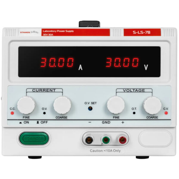 Zasilacz laboratoryjny marki Stamos Soldering pozwala dostarczyć zewnętrznym urządzeniom prąd stały o określonym napięciu. Stanowi idealne narzędzie w przemyśle, laboratoriach, telekomunikacji, warsztatach i nie tylko. Doskonała efektywność sprzętu wynika z zastosowania jednego kanału zapewniającego napięcie wyjściowe w zakresie 0-30 V oraz prąd od 0 do 30 A. Ponadto produkt generuje prąd o bardzo niskim tętnieniu i szumie (≤ 1% RMS), który nie uszkadza obwodu zasilającego.