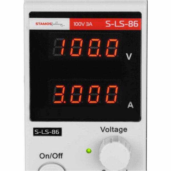 Zasilacz laboratoryjny marki Stamos Soldering sprawdzi się w przemyśle, laboratoriach, telekomunikacji, warsztatach itp. Zastosowana technologia zapewnia niski poziom tętnień i szumów. Duże wyświetlacze LED pozwalają w każdej chwili bez problemu odczytać ustawione wartości. Regulacja ustawień następuje poprzez pokrętła. Umożliwiają one dokładne ustawienie napięcia wyjściowego od 0 do 100 V oraz prądu wyjściowego od 0 do 3 A. Jeśli zasilacz pracuje jako źródło stałego napięcia (CV), automatycznie przełącza się na pracę ze stałym prądem (CA) po osiągnięciu ustawionego limitu obciążenia. Zapobiega to uszkodzeniu podłączonych urządzeń. Sprzęt wyposażono w zabezpieczenie przeciążeniowe (OPP) oraz zabezpieczenie przed przegrzaniem (OTP), które automatycznie uruchamia wentylator po przekroczeniu maksymalnej temperatury. Antypoślizgowe gumowe nóżki zapewniają stabilność urządzenia i chronią powierzchnię przed zarysowaniami.