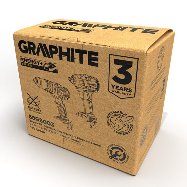 Zestaw E+: klucz udarowy bezszczotkowy 58G028 z wiertarko-wkrętarką bezszczotkową z udarem 58G020, 58GS003 marki GRAPHITE to elektronarzędzia funkcjonujące w oparciu o system akumulatory Energy+.