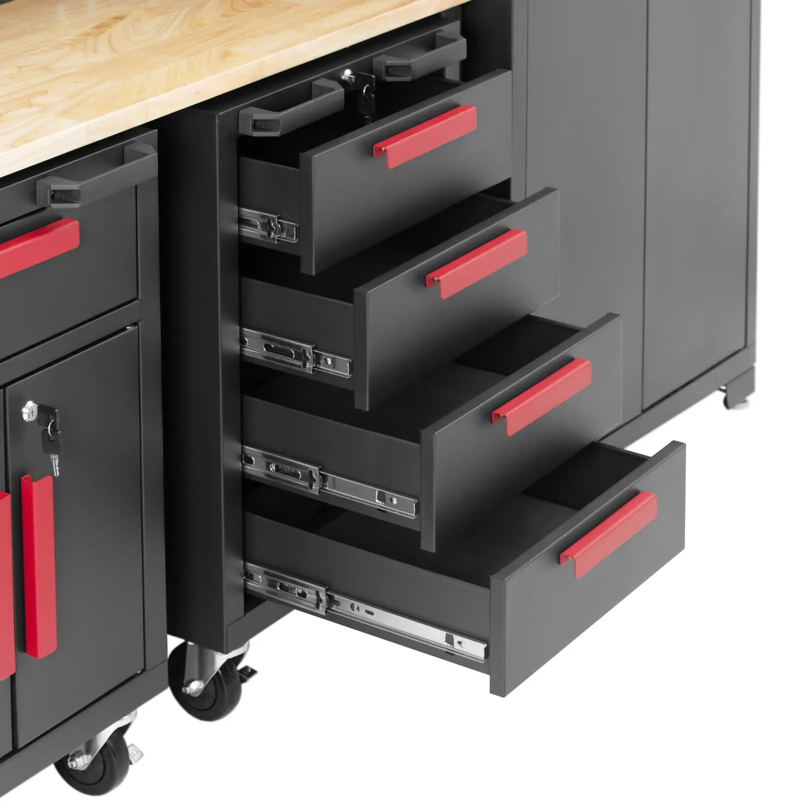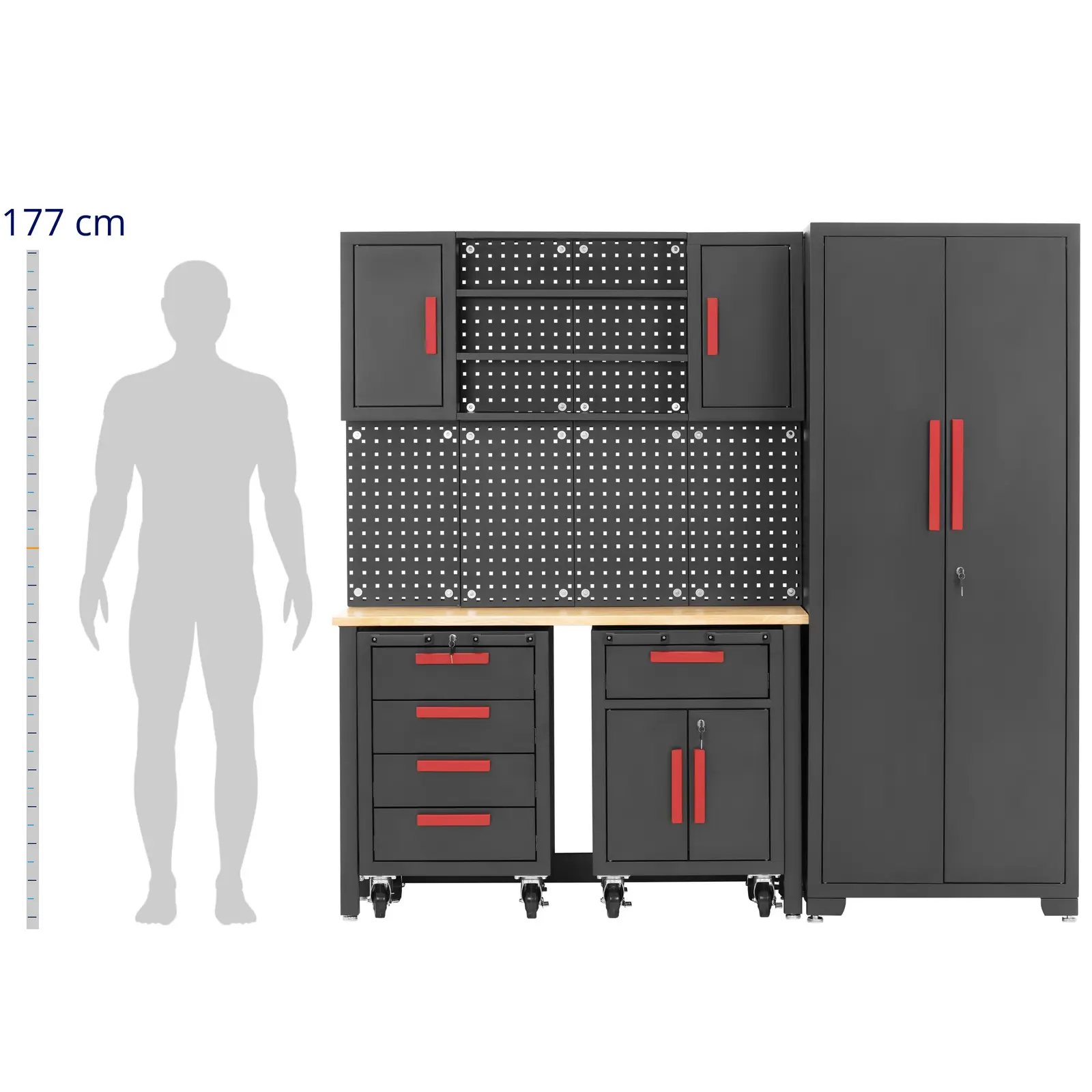 Zamykana szafka warsztatowa marki MSW oferuje dużo miejsca do przechowywania. Perforowana ściana, 4 przestronne szuflady i szafki w różnych rozmiarach na wszystko, czego potrzeba do pracy. Szafę i szafki na kółkach można zamknąć na klucze, dzięki czemu narzędzia będą zawsze bezpieczne. Szafka wykonana z metalu i drewna wytrzyma nawet intensywne użytkowanie. Stół roboczy wytrzymuje obciążenie do 200 kg, półki 50 kg, a w praktycznych szafkach ściennych można przechować narzędzia o wadze do 30 kg. Szafki wykonane są z wytrzymałej stali. Drewniany blat jest wyjątkowo mocny. Powierzchnia robocza 132 x 42,7 x 2,5 cm oferuje dużo miejsca na narzędzia i materiały. Stół z twardego drewna można w każdej chwili wysunąć i wykorzystać jako mobilne miejsce do pracy. Modułowa szafa zawiera dwie metalowe szafki. Każda z nich stoi na 4 lekkobieżnych kołach z łącznie 2 hamulcami. Po wysunięciu szafki do przodu można na nich usiąść i pracować przy stole roboczym. Po skończeniu pracy, wystarczy wsunąć ją z powrotem pod blat, aby zaoszczędzić miejsce. Szafa posiada 3 półki, które można zamontować na żądanej wysokości. System mebli warsztatowych jest modułowy, dzięki czemu poszczególne elementy można rozmieścić według potrzeb. Szafa stoi na regulowanych nóżkach o wysokości do 25 mm. Dzięki temu bez wysiłku można dostosować ją do wszelkich nierówności podłogi i zapewnić właściwy poziom. Aby zapewnić dodatkową stabilność należy przymocować szafę warsztatową do ściany, aby nie mogła się przewrócić.